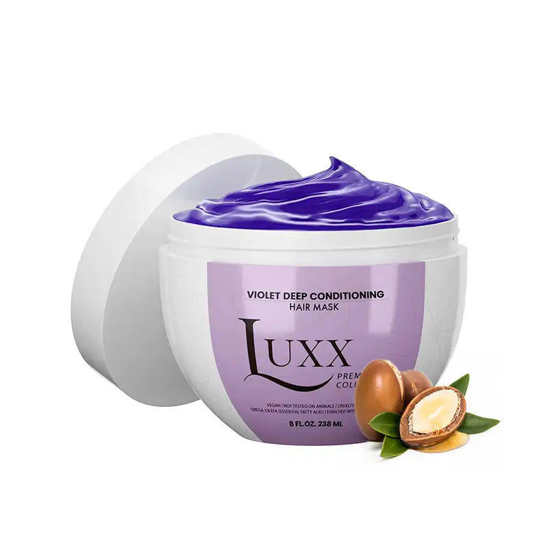 Elevate your haircare routine with Luxx Violet Deep Conditioning Mask, a luxurious hydrating treatment specially formulated for colour-treated hair. Infused with violet pigments, this mask effectively neutralises unwanted brassy orange and yellow tones, leaving your hair with a cooler, more vibrant hue. Enriched with the innovative Fermentoil Hair Complex, a premium blend of five fermented oils - argan oil, camellia sinensis oil, green tea seed oil, sunflower seed oil, and sweet almond oil. It deeply nourishes and hydrates your strands while fighting frizz and enhancing manageability.